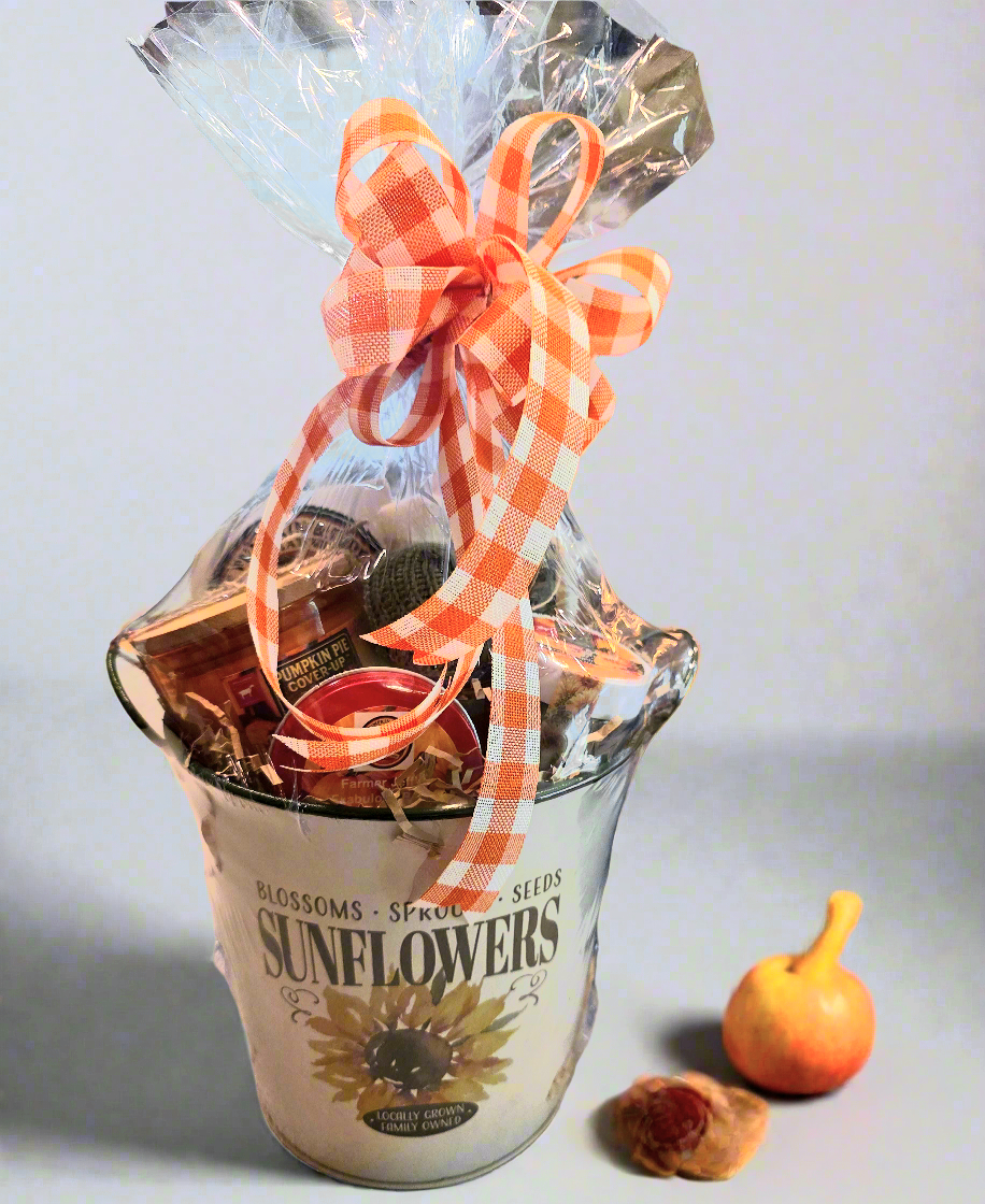 - All packaged in a metal decorative bucket with liner. (1 of 2 different designs, pumpkins, sunflowers)